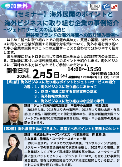 『海外展開のポイントと海外ビジネスに取り組む企業の事例紹介 in越谷市 ―ジェトロサービスの活用法と越谷発ブランドの海外展開への取り組み事例―』